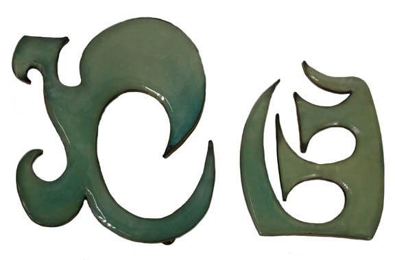 A pair of badges representing ‘alien' characters comprised of polished, translucent, taupe colored paste poured into a formed metal backing. They both feature pins with clasps on back for attachment to fabric. Believed to have been worn in various Star Trek feature films. One measures 6.75 X 5.75 and the … |