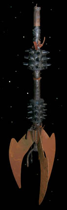 A prop weapon appearing on the wall in scenes from the Star Trek: Voyager episode "Flesh and Blood" where the holograms the Hirogen used for hunt training turned on them and massacred their masters. The weapon is a staff wrapped in leather strap, with plastic spikes on the handle leading … |