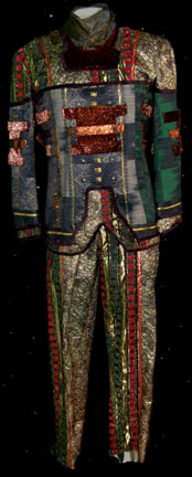 A guard costume from the pre-industrial planet featured in the Star Trek: Voyager episode “Muse” in which “Kelis” (Joseph Will) was inspired to write a play about the Voyager crew. The costume includes a mauve heavy woven tunic that is made to look intentionally grubby and brown trousers with lacing … |