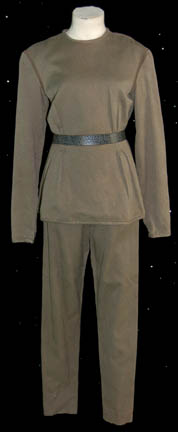 Featured in the final episode of Star Trek: Voyager, “Endgame”, during a scene in which Reginald Barclay teaches a class on the Borg to a group of Starfleet cadets. This full-length gray future Starfleet jumpsuit features stirrups for the feet, a zippered seat and another zippered back seam, black piping … |