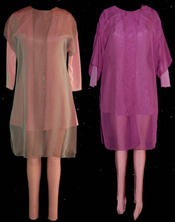 A costume featured in Star Trek V: The Final Frontier for wear by Cynthia Gouw as “Caithlin Dar”, Romulan representative to the Planet of Galactic Peace. The costume is four sets of form fitting black synthetic stockings for wear under a two layer sleeveless dress composed of a plum colored … |