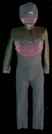 A costume featured in various episodes of Deep Space Nine. This costume is a full-length, long-sleeved tan jumpsuit featuring magenta-colored accents along the inside of the sleeves, down the ribs and outer part of the legs; a zip up the back and stirrups for the feet. The costumer's tag reads … |