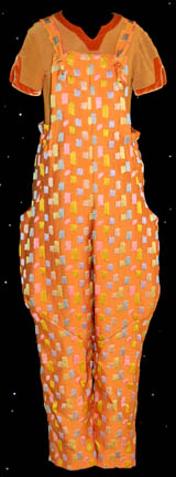 A costume for wear by Scarlett Pomers in the role of the first child born on “Voyager”, half-Ktarian, half-human “Naomi Wildman”; two short-sleeved, legless jumpsuits in a pumpkin-colored velveteen fabric, and matching overalls featuring a multi-colored, textured brocade of random shapes and large, deep pockets. One of the undershirts is … |