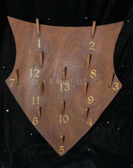 A prop game board featured in the Star Trek: Voyager episode “Fair Haven” and “Spirit Folk”. The item is a large shield shaped wooden board with multiple pegs driven into it which are numbered for the game of ‘rings’. The item was created by prop makers at HMS (Hand Props, … |