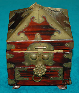 This ornate wooden box was used as set dressing during the filming of Star Trek episodic television. Its square shape rests on four small feet and it has a pyramid shaped lid. Attached to its surface is shaped metal creating detail and design. In the front is a small drawer … |