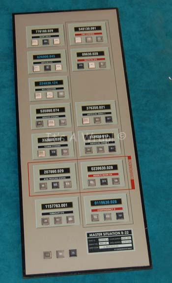A console button board like those appearing variously on the set of the “Enterprise NX-01” in episodes of Star Trek: Enterprise. The item is composed of black sheet plastic with a graphical application adhered to the face and several banks of rubber faux buttons. The graphic is made to identify … |
