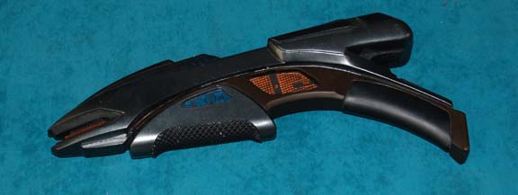 A prop Romulan disruptor rifle like those appearing in various episodes of Star Trek: Deep Space Nine like “Improbable Cause”. This item is a solid cast resin painted metallic-pewter featuring black, metallic-copper, and green accents. The sides of the prop feature green painted ‘Romulan' character letters and the item measures … |