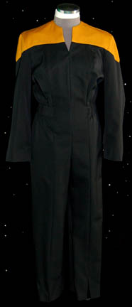 A costume featured in the tenth Star Trek feature film “Nemesis”. This costume consists of a long-sleeved, full-length, black Starfleet uniform jumpsuit featuring gray quilted shoulders, sewn on ‘away team' gear loops at the waist, a Velcro patch for a combadge (sold separately), and operations gold division strips sewn onto … |