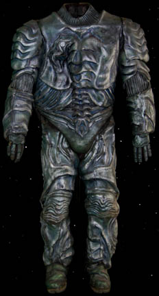 A massive molded foam rubber body suit featured in multiple episodes of Star Trek: Voyager for wear by Hirogen Hunters. The costume is painted metallic silver with an iridescent sheen, and comes with a pair of matching molded shoes and gloves, and features a battery operated light molded into the … |