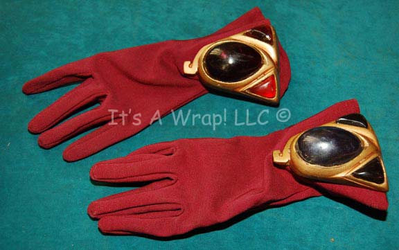 A pair of plum colored gloves like those worn by Vulcan fal-tor-pan ceremony guards in Star Trek III: The Search for Spock. The gloves are colored spandex that fit snugly around the wrists and extend pas them for form. On the back of the wrists are large molded ‘jewels’ with … |