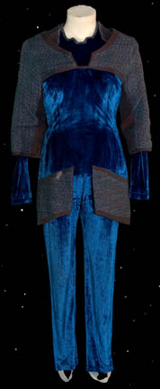 A costume featured in the Star Trek: Deep Space Nine episode “The Emperor's New Cloak” for wear by Chase Masterson as “Leeta”, a member of the Terran Rebellion. The costume is plum colored tights over which is worn a blue suede bodice with attached long sleeves with a red and … |