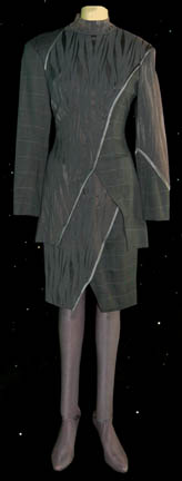 A costume featured in the Star Trek: DS9 episode “Through the Looking Glass” for wear by Felicia Bell in her portrayal of “Jennifer Sisko”, wife to the Mirror Universe “Ben Sisko” (Avery Brooks). The costume is a 2 piece jacket and skirt, both of gray wool with gray brocade, and … |