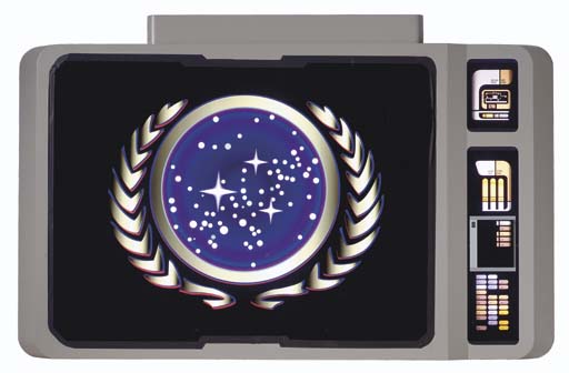 A Starfleet-style prop wall-mounted viewscreen with a large backlit graphic displaying the <I>United Federation of Planets</I> seal, screen -- <I>39x52in.</I> -- [interior lighting fixtures untested] used as set dressing on <I>Star Trek: Deep Space Nine</I> |