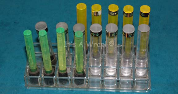 A lot of prop items featured in 24rd century Star Trek episodic television. The lot consists of multi-colored acrylic cylinders of various sizes, most featuring alien script on the end and some with adhesive or the residue of adhesive on the other end. Included is a clear, plastic rack to … |