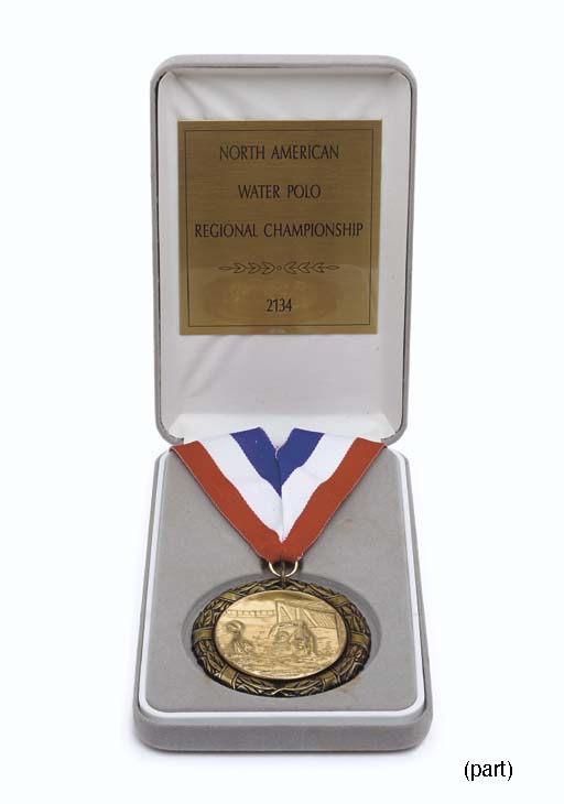 A water polo ball, with <I>NFHS</I> trademark, labeled <I>Men's Size</I>, brand name painted out; and two awards, one a certificate co-signed by Jake Elwood [an apparent gag reference to The Blues Brothers], the other a medal in presentation case, both presented for Archer's team's victory in the North American Water … |