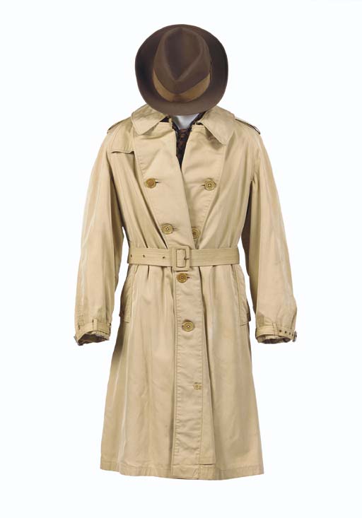 A full-length beige trench coat with <I>Aquascutum</I> label inside, with silk patterned tie and brown felt fedora -- all purchased for Patrick Stewart as Captain Picard playing <I>Dixon Hill</I> in "Manhunt" in <I>Star Trek: The Next Generation</I>; with corresponding wardrobe tag (3) |