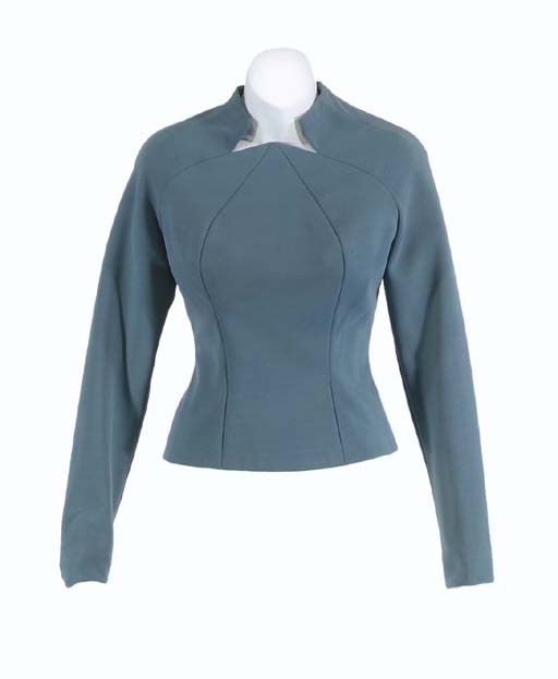 A woman's Starfleet uniform shirt of blue polyester doubleknit, with symmetrical body contouring seams, long sleeves, notched collar, and built-in bra -- designed by William Ware Theiss, believed to be a prototype for <I>Star Trek: Phase II</I> |