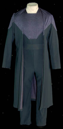 “Mora Pol” (James Sloan) was a Bajoran scientist who was assigned to study and teach the Changeling “Odo” (Rene Auberjonois) after he was discovered. He wore this costume in the Star Trek: Deep Space Nine episodes “The Alternate” and “The Begotten”. The jacket is gray with white pin stripes on … |