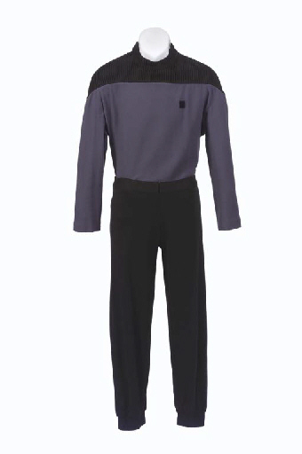 A grey Starfleet uniform-style casual top trimmed at the shoulders with ribbed black nylon, with <I>Star Trek: The Next Generation</I> label inside inscribed <I>Patrick</I>, with a pair of black wool pants, similarly labeled -- worn by Patrick Stewart on <I>Star Trek: The Next Generation</I>; accompanied by another identical top, torn … |