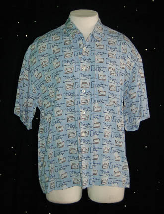 A 100% Rayon, blue patterned button front shirt with a pocket on the left breast worn by Robert Duncan McNeil while portraying “Tom Paris” in the episode “Future's End, Part II” of Star Trek: Voyager. Masquerading as natives in Los Angeles, on Earth, in 1996, the crew of Voyager was … |