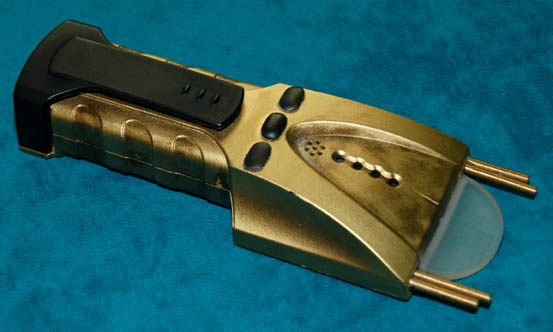 An electronic alien scanner made for use on Star Trek episodic television. Made of plastic painted gold with metal accents, the scanner has an acrylic semi-circular top that glows green when activated by a button on the top. A separate button on the side activates four orange LED lights along … |