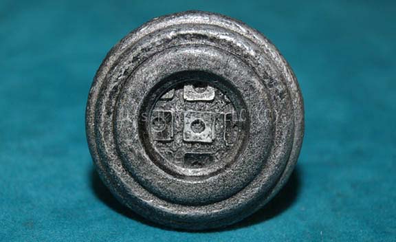 A molded resin badge with wire backing created for Star Trek episodic television. The item is molded in the same fashion as Klingon baldric emblems with circular raised features and painted metallic silver. Measures approx. 1.5 X 0.5 inches. |