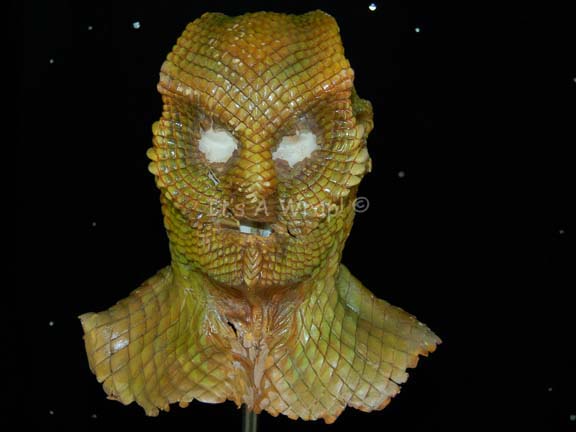 A well preserved alien mask liked those featured in Star Trek episodic television and Star Trek feature films. The item is a cast latex, full head mask that has a reptilian/fish-like appearance with holes for the eyes, mouth and small breathing holes. The mask is carefully painted a yellow/green color … |