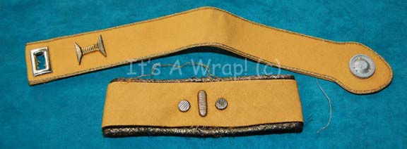 A Starfleet costume accessory like those appearing in Star Trek II: The Wrath of Khan through Star Trek VII: Generations. The items are officer’s styled Starfleet division strips made from gold colored fabric with various embellishments. The shoulder strip features a metallic silver painted molded resin ‘security disk’ on the … |