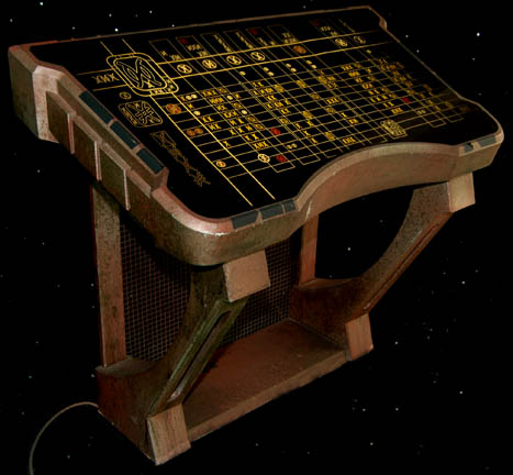 A large set console item featured in the Star Trek: Enterprise episode “Anomaly”. The item is constructed of wood with a large acrylic panel inset with a graphical application adhered to the inside that is visible when backlit. The item features a variety of “Osaarian” iconography appearing in the episode … |