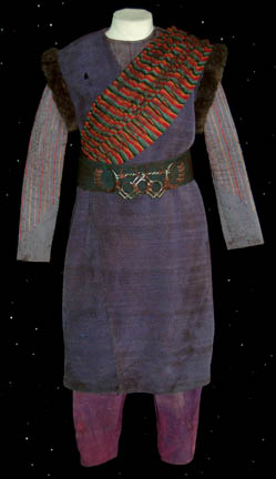 A ‘Kazon' costume featured in the Star Trek: Voyager episode “State of Flux”. Composed of purple leather pants, a blue long sleeved shirt with red and yellow line pattern, and a purple double breasted sleeveless robe that Velcro’s shut in front with fur trim on the shoulders with a molded … |