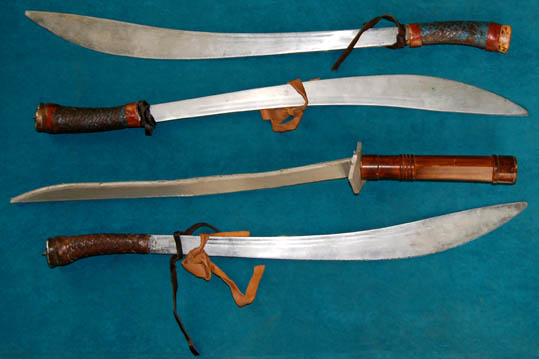 A lot of prop weapons used variously in Star Trek episodic television. These items are prop weapons that seem a cross between a scimitar and the Chinese Dao; three of the weapons are real metal swords minus the blade edge, and have lengths of leather strap tied around the rain … |
