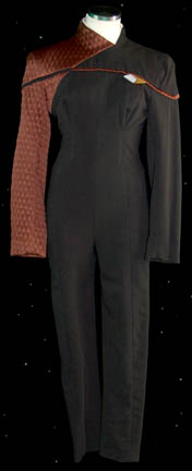 A costume featured in the Star Trek: The Next Generation episode “Redemption” for wear by Whoopi Goldberg in her portrayal of “Guinan” during which she attempts to convince “Worf” (Michael Dorn) of his commitment to honor and the truth. The costume is textured trousers and crushed velvet top with shoulder … |