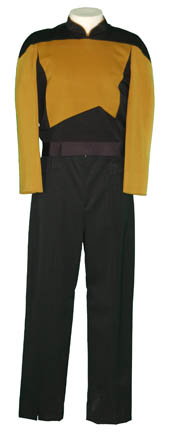 This mustard yellow uniform is typical of Star Trek: The Next Generation costumes after season three, thus introducing the Mandarin collar and eliminating the piping around the neck and shoulders. This style creates the two-piece uniforms worn for the rest of the series comprised of a uniform jacket, and black … |