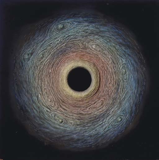 A visual effects model of a solar system formation made from plaster and mixed material on black laminate board on plywood, open area at center allows for a "star" (light bulb) to be inserted for filming -- <I>48x48in.</I> -- designed by Mike Okuda and Rick Sternbach and featured in the … |