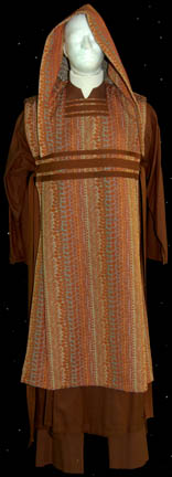 A costume featured in the ninth Star Trek feature film “Insurrection”. This costume is that of a Ba’ku male and consists of a long-sleeved, pumpkin-colored shirt, metal latch at the collar, a gray vest with oversized shirt tails, and brown trousers. A sewn in tag in all three items reads … |