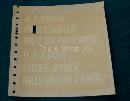 A lot of unused graphical applications made for episodes of Star Trek: Deep Space Nine. The item is a series of white adhesive lettering spelling out the name of character “Miles O’Brien” (Colm Meaney) in variations ‘M. E. O’Brien’, ‘Miles E. O’Brien’, and ‘Miles Edward O’Brien’. The first set of … |