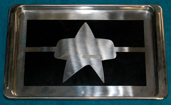 This great Starfleet tray was used as set dressing onboard the U.S.S. Defiant in the mess hall during the Star Trek: Deep Space Nine series. The tray is metal with a black vinyl covering featuring the Starfleet arrowhead symbol. Due to time and use there are several marks and scratches … |
