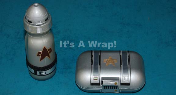 A lot of Starfleet ration packs like those appearing in Star Trek IX: Insurrection. The items are a plastic water bottle and a molded resin flip-top box, both painted metallic silver with adhered Starfleet themed graphical applications applied to them and multiple metallic silver and gold adhesive accents and details. … |