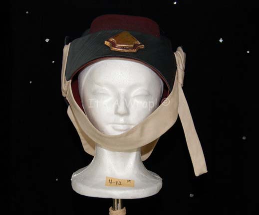 A costume element of the style featured in “Search for Spock” but specifically in “The Voyage Home”. A violet, felt hat in the Vulcan-style featuring iridescent black trim, accent in the back, and stylized Vulcan ‘ears’; tan, linen chin strap secured around the ‘ears’ and further trim that covers the … |