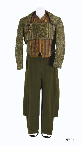 Five costumes, comprising: Rom's costume from "Little Green Men" consisting of a jacket, two vests, and a jumpsuit; Nog's costume from "Little Green Men" consisting of two vests, two jumpsuits, and two jackets; Quark's costume from "Little Green Men" consisting of jacket, vest, shirt, jumpsuit and loose accessories; Ishka's spotted … |