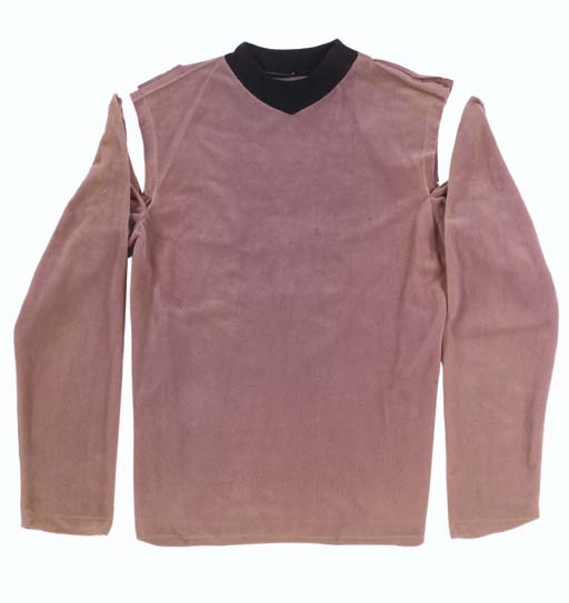 A velour pilot-style Starfleet uniform top, formerly sciences blue, now faded to mauve, with black series-style collar, zipper in back, separated sleeves -- believed to have been made for the <I>Star Trek: Original Series</I> pilot episodes and subsequently modified for use in the series itself |