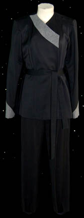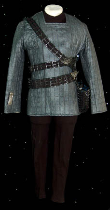 A Romulan costume featured in various episodes of Star Trek: Deep Space Nine for wear by Tal'Shiar operatives. The costume is a full length black thermal jumpsuit with a square patterned quilted uniform jacket top. The top features collar line zips and iridescent silver square pattern. The costume is completed … |