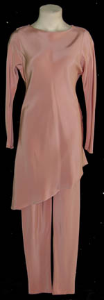 A 2-piece set of pajamas made from pink silk with an asymmetrical hem. The item features a sewn in Deep Space Nine tag reading ‘Nana Visitor' and the costumer’s tag reads ‘DS9 #527, Kira, Nana Visitor’ and lists the components. Episode #527 is listed as being “Rocks and Shoals” in … |
