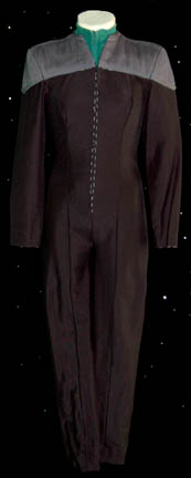 A distressed Starfleet uniform jumpsuit featured in Star Trek: Deep Space Nine for wear by Terry Farrel in her portrayal of “Jadzia Dax”. The costume is a black form fitting jumpsuit with grey quilted shoulders and sciences blue division trim on the cuffs, with a blue sleeveless undershirt. The costume … |