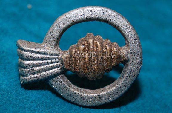 A molded resin rank accent for costumes appearing in various Star Trek feature films. The item is a small circle painted metallic silver with a similarly painted flair protruding from the top and a gold painted diamond center piece. The item features metal wire glued to the reverse for attachment … |
