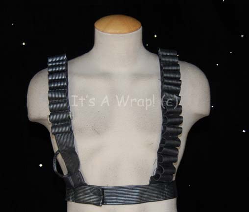 A prop item featured in the Star Trek: Voyager episode “Shattered”; wherein a temporal distortion shatters “Voyager” into numerous other timeframes where only “Commander Chakotay” (Robert Beltran) can move between. This item is one of the custom made bandoliers that held the chroniton-infused serum, a black vinyl belt/bandolier with slots … |