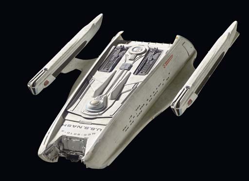 A winged alien visual effects spaceship model, designed by Rick Sternbach -- <I>31x25in.</I> -- originally built as the Romulan scout ship for "The Defector" in <I>Star Trek: The Next Generation</I>, also used as a Romulan science vessel in "The Next Phase" and currently modified as a <I>Nasari</I> ship |