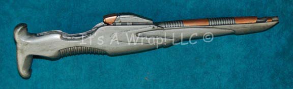 A prop weapon featured in various episodes of Star Trek: The Next Generation that involved Romulans. This weapon was the standard sidearm for the Romulan Military during the 24th century and is a sleek, resin cast dark, metallic-pewter hand weapon with iridescent red accents that appear yellow from another direction, … |
