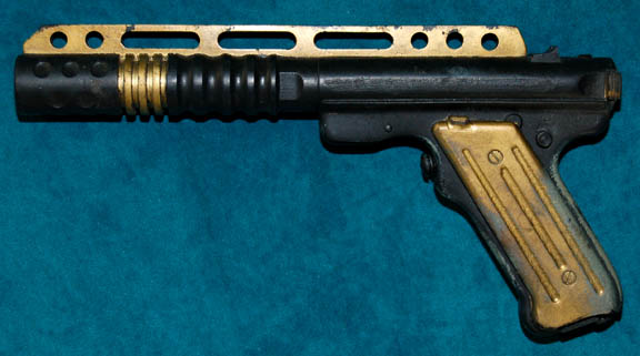 A prop weapon similar to those featured in various episodes of Star Trek: Enterprise. This prop weapon is a black, rubber cast pistol with gold-colored accents on the grip, along the barrel, and is generally based on the design of the 45 caliber pistol. The item measures approx. 11 X … |