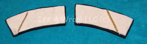 A pair of costume items similar to those featured throughout the first Star Trek feature film. Each division strip is on a black felt backing, is white in color denoting membership to the Command division with a thin, gold braid embellishment. Speculation persists that the braid embellishment may denote the … |